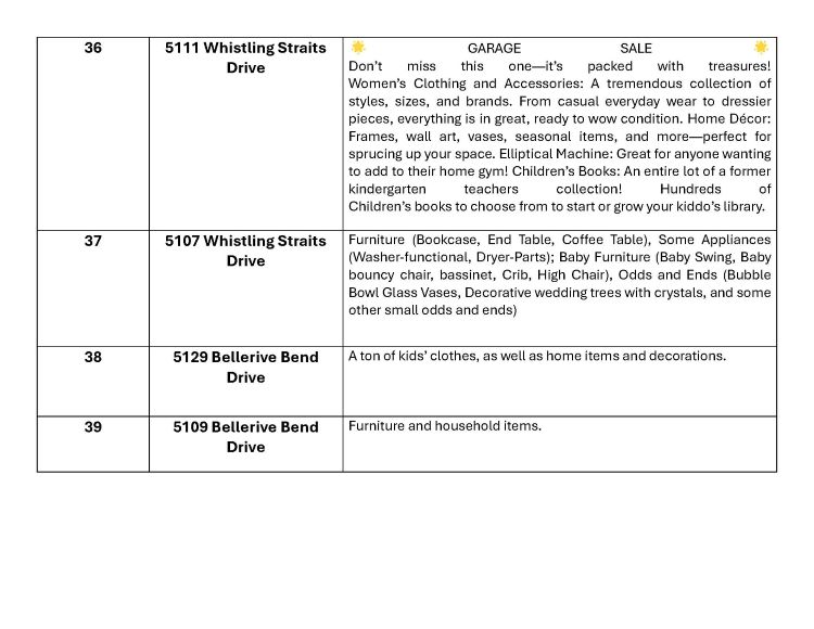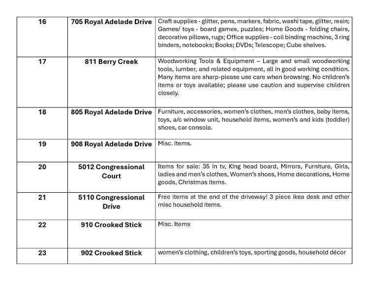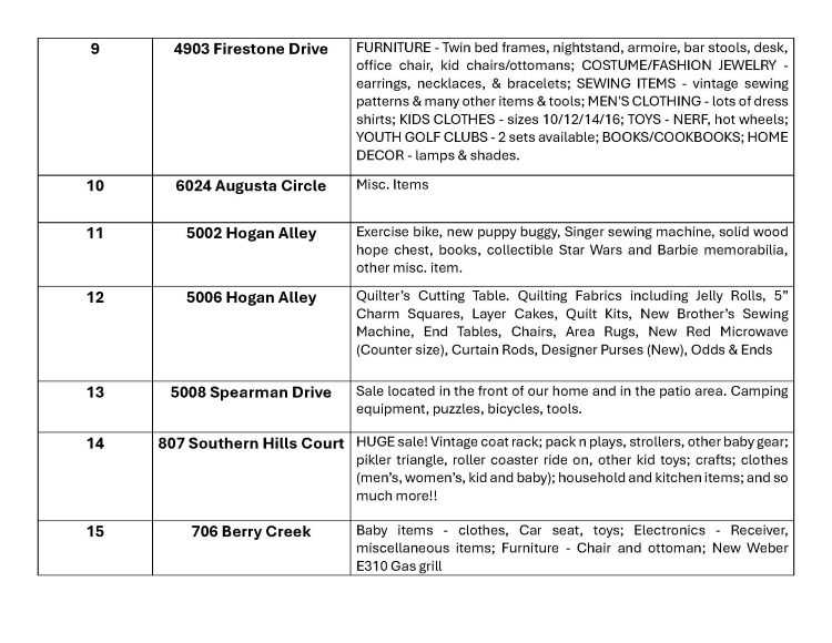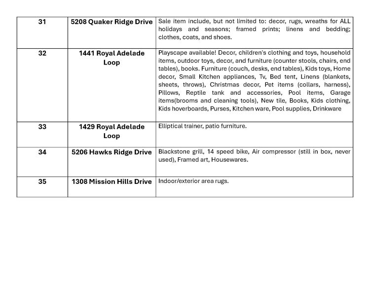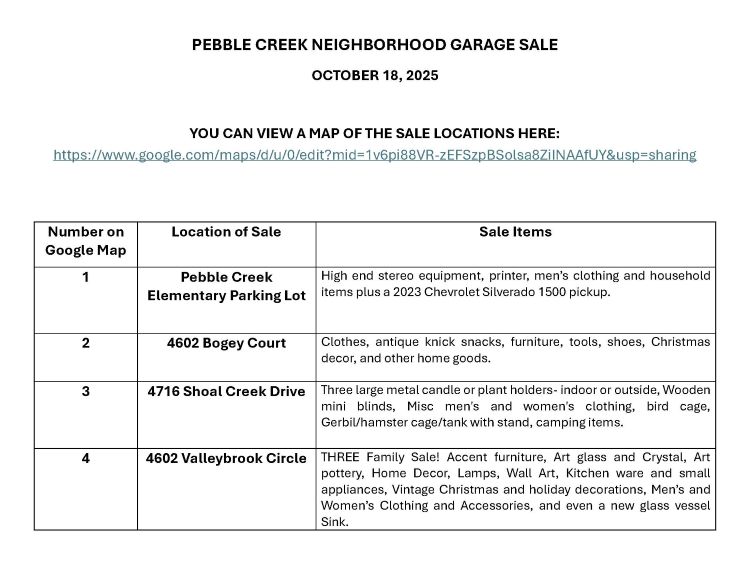 PEBBLE CREEK NEIGHBORHOOD GARAGE SALE Map of Sales Here: Google Map Link PDF of Sale Location List Here: Sale Location List Also, Photos of Sale Location List Below:
